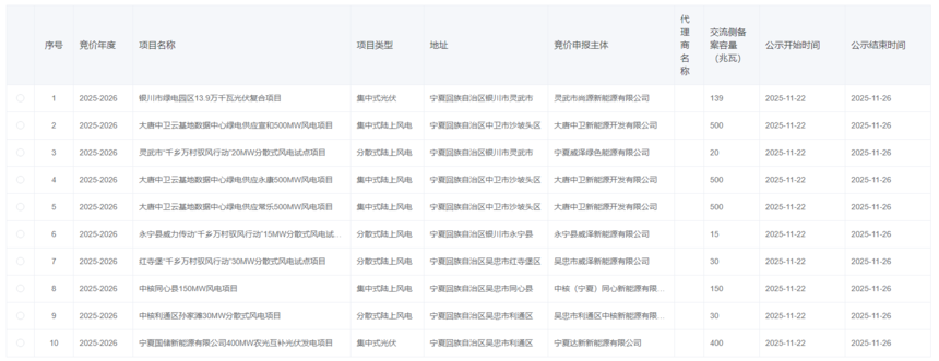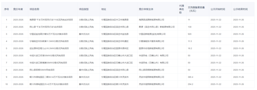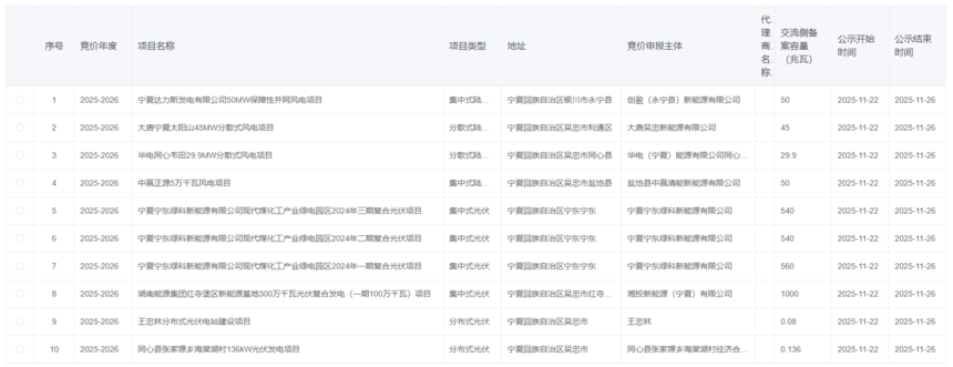 841个项目!宁夏机制电价竞价资质名单公布2025年11月22日,国网新能源云公布2026年宁夏机制电价竞价资质,共计公示841个项目。其中,集中式光伏25个,集中式风电16个,分散式风电23个,分布式光伏777个。 集中式光伏共计25个,合计容量13965.4MW.集中式风电共计16个,合计3266.5MW。分散式风电合计23个,合计容量为723.45MW。 具体见下: